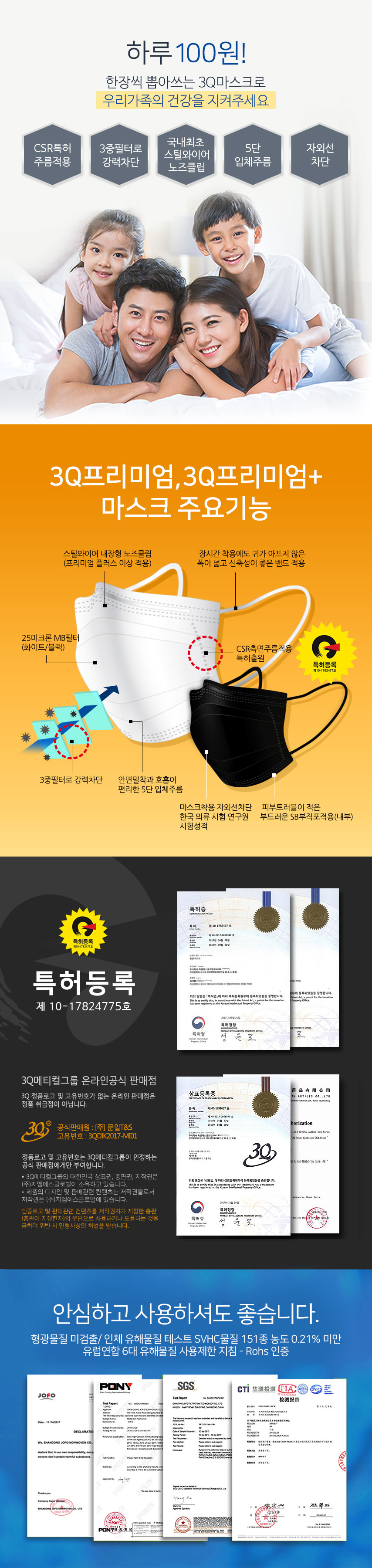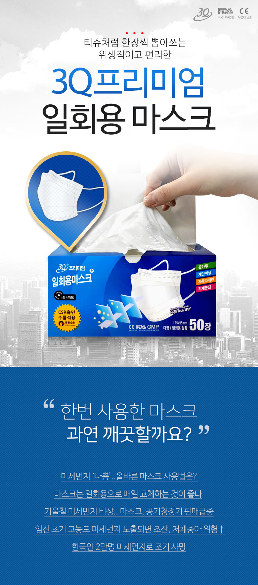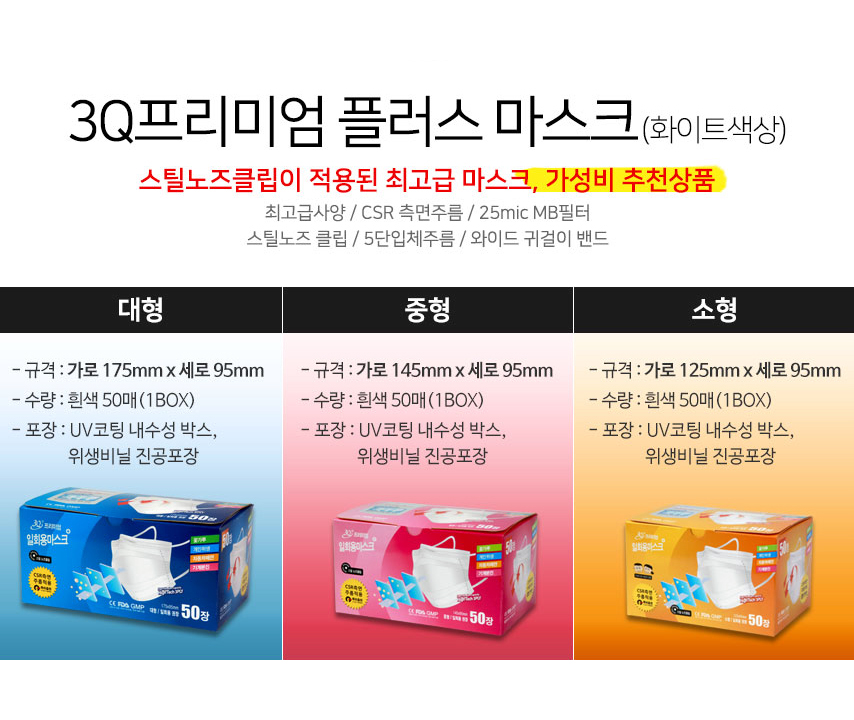 3Q 프리미엄 일회용 마스크 플러스(대형/50개)
